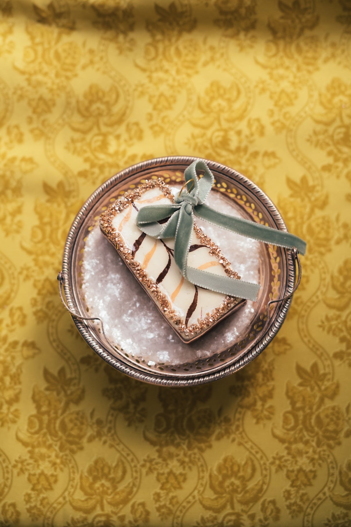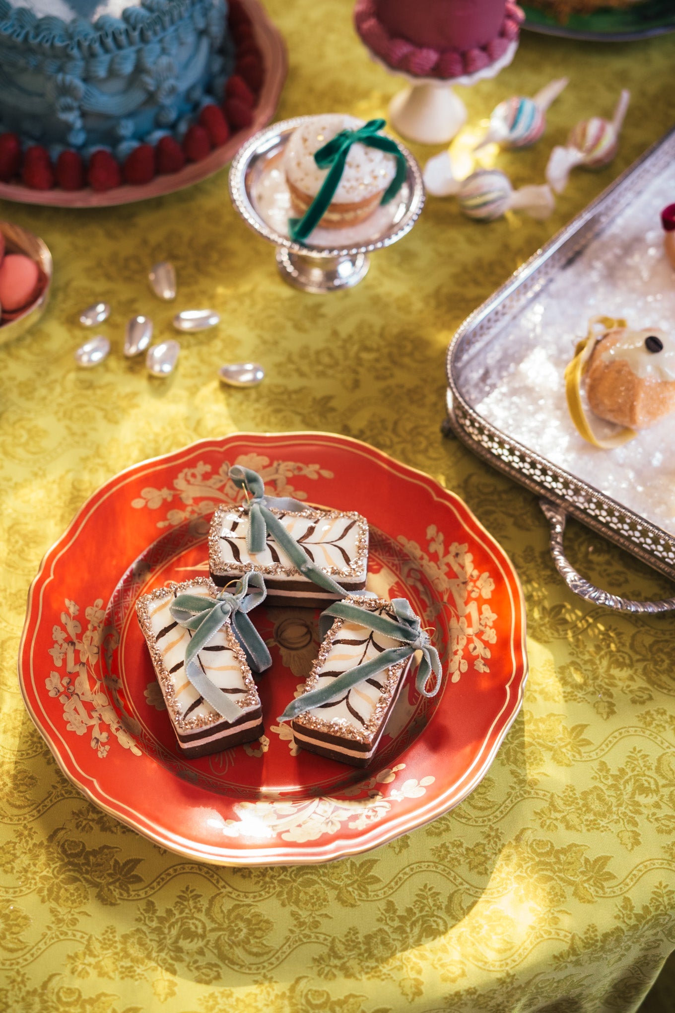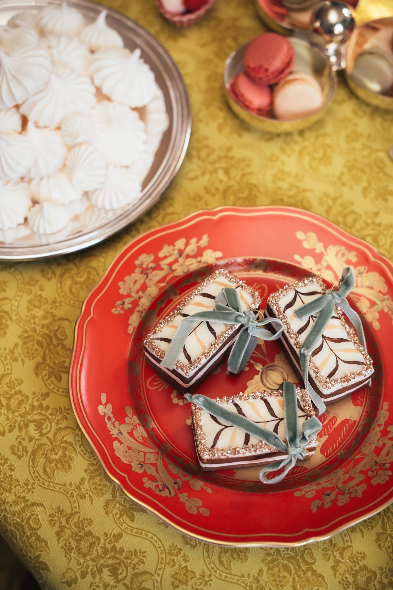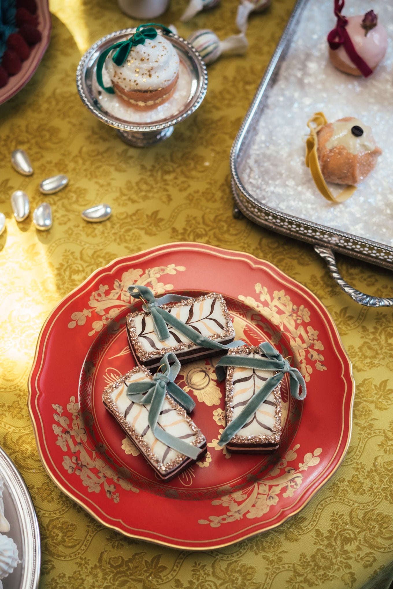 This stunning collection of bonbons and holiday treats are each painted, glossed and glittered by hand. Finished with an Italian velvet ribbon.