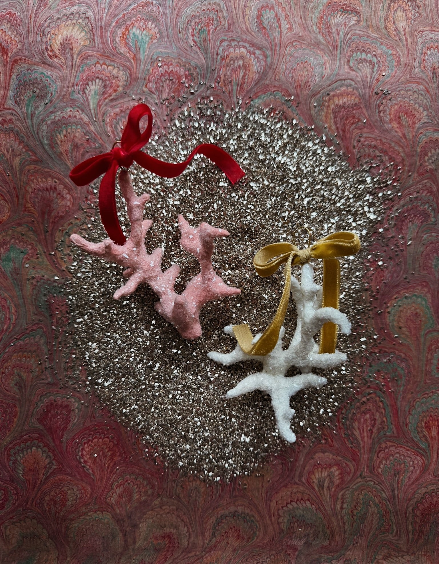 Inspired by joyful celebration, our collection of gilded shells are each painted and glass glittered by hand. Finished with an Italian velvet ribbon.