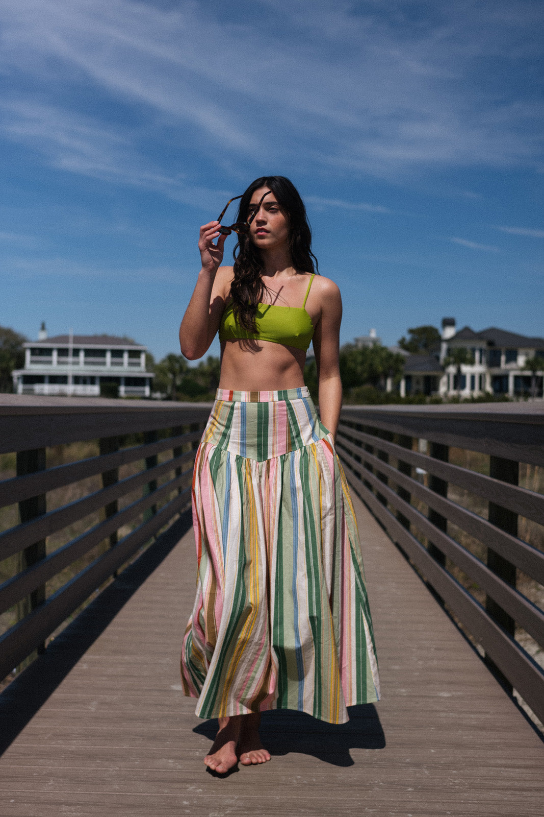 Reintroducing our Iris skirt. Crafted from linen, this gathered maxi-length skirt captures the essence of our latest collection. The drop basque waist and gathering create a graceful silhouette that's both flattering and timeless.