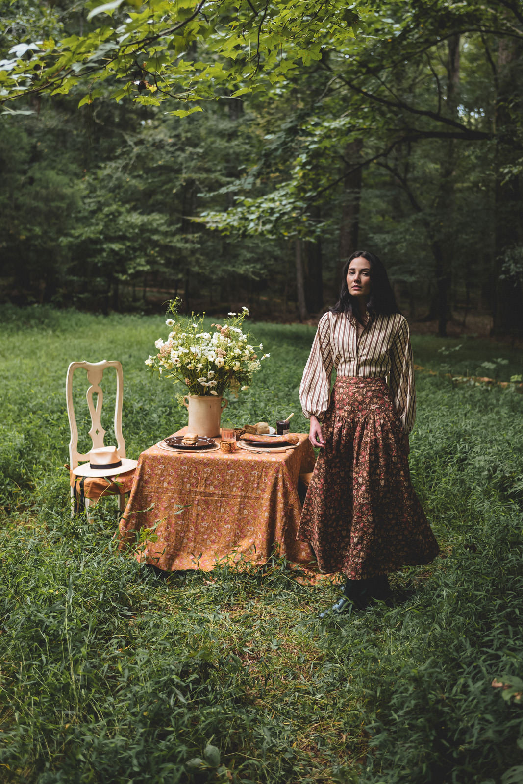 Introducing our Iris skirt. Crafted from linen, this gathered maxi-length skirt captures the essence of our collection. The drop basque waist and gathering create a graceful silhouette that's both flattering and timeless. Made here in our rich Daphne print, featuring warm shades of rose, fern and chocolate hues, it's a true statement piece.