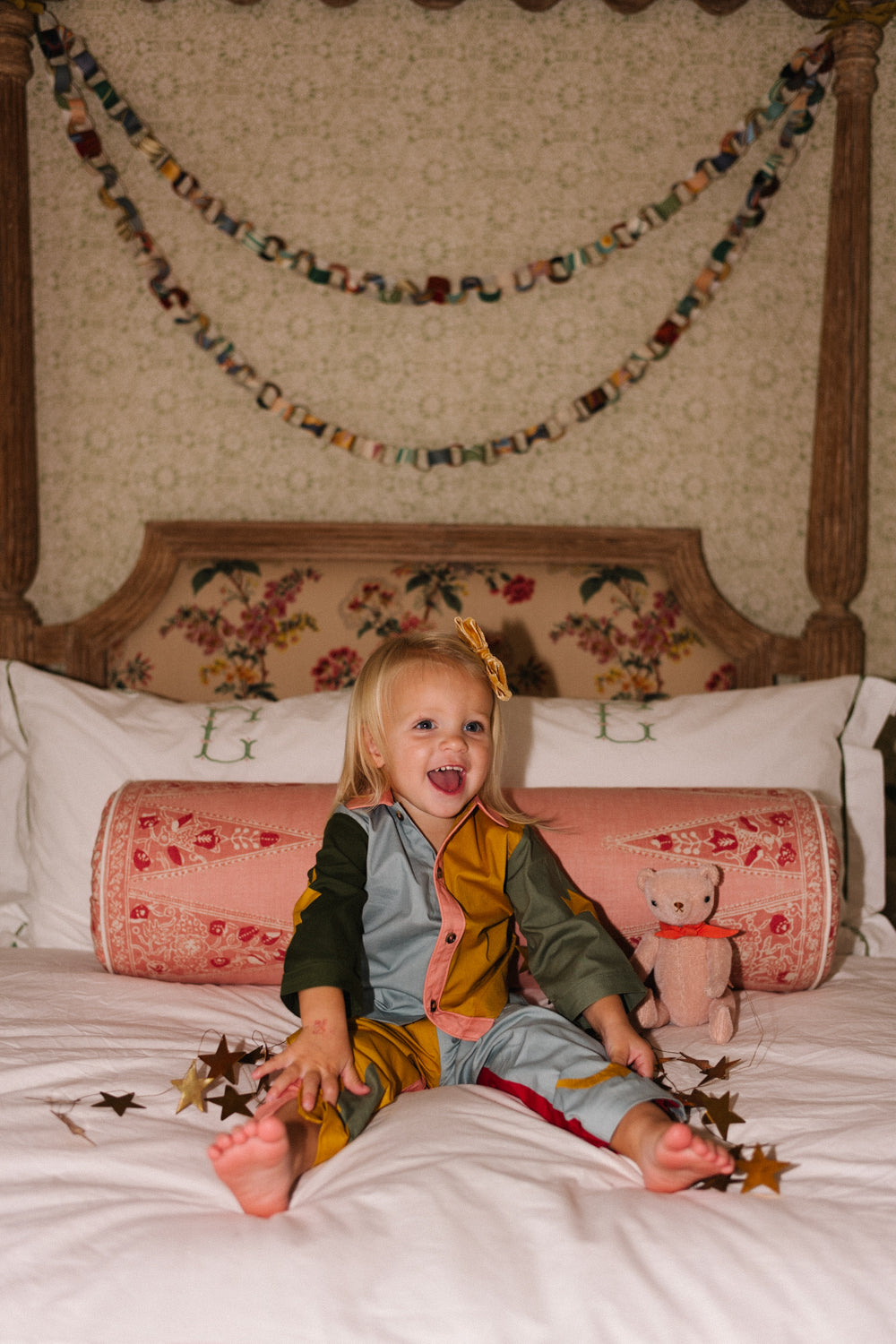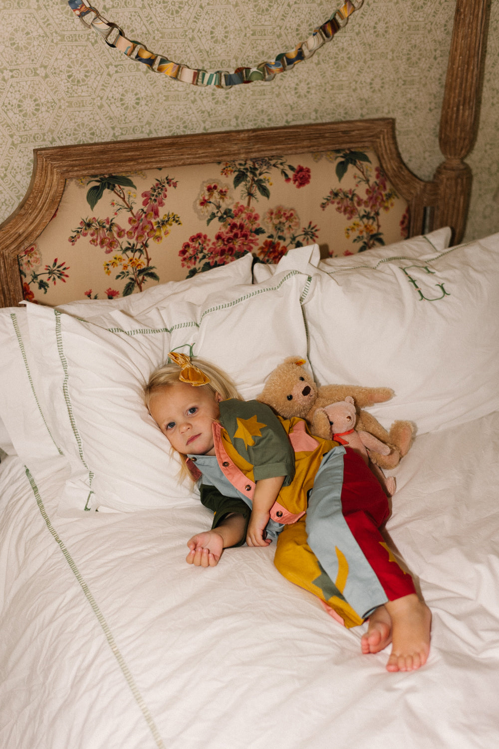 Charmingly old-world, this little's playsuit is merry and bright in joyful cirque colors. Dyed cotton patchwork is overlaid with celestial shapes and self-piping.